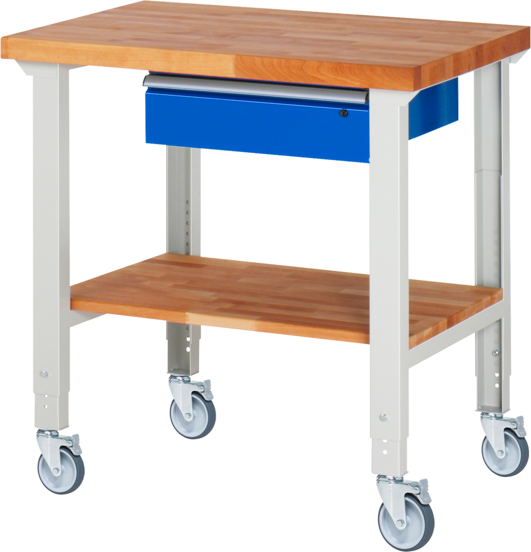 Fahrbare Werkbank Modell 7001 schwarz, BxTxH 1000x700x950-1000 mm, Buche-Massiv Arbeitsplatte 40 mm, 1 Schublade mit Auszug 90 %