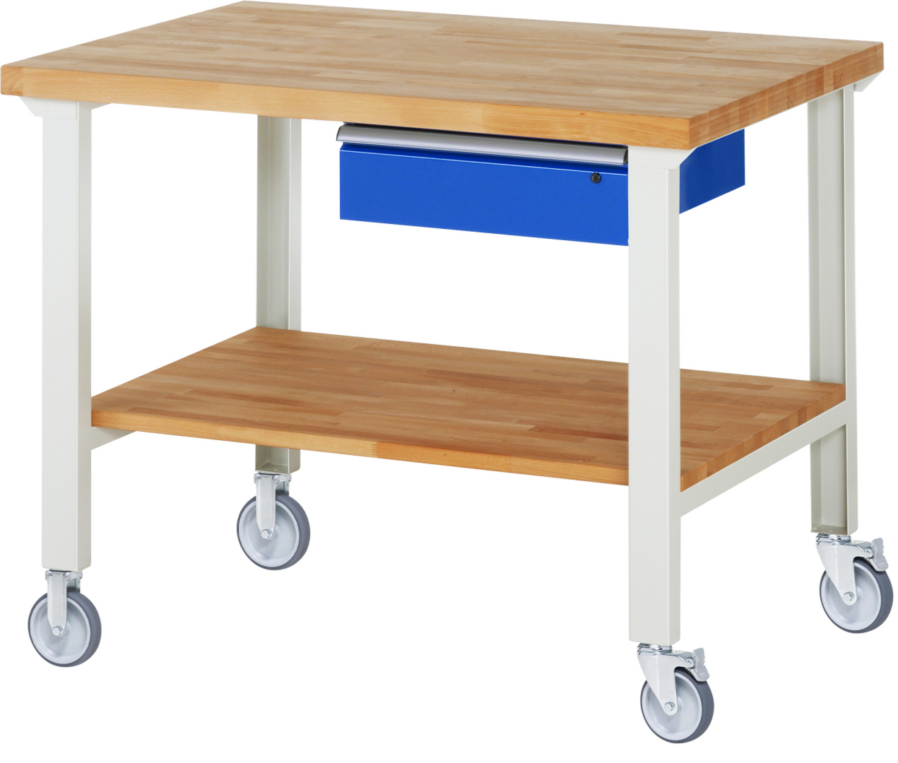 Fahrbare Werkbank Modell 7001 schwarz, BxTxH 1250x900x1000 mm, Buche-Massiv Arbeitsplatte 40 mm, 1 Schublade mit Auszug 90 %