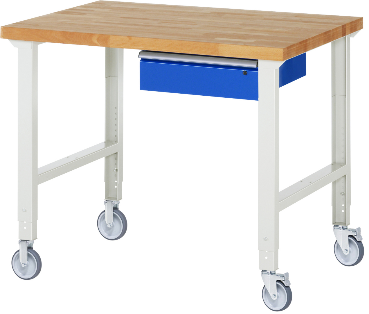 Fahrbare Werkbank Modell 7001 schwarz, BxTxH 1250x900x950-1000 mm, Buche-Massiv Arbeitsplatte 40 mm, 1 Schublade mit Auszug 90 %