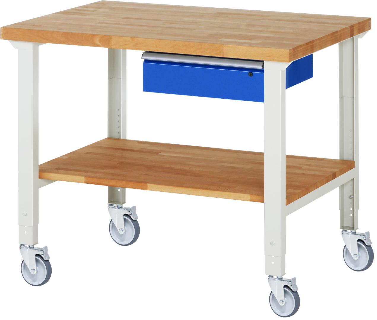 Fahrbare Werkbank Modell 7001 schwarz, BxTxH 1250x900x950-1000 mm, Buche-Massiv Arbeitsplatte 40 mm, 1 Schublade mit Auszug 90 %