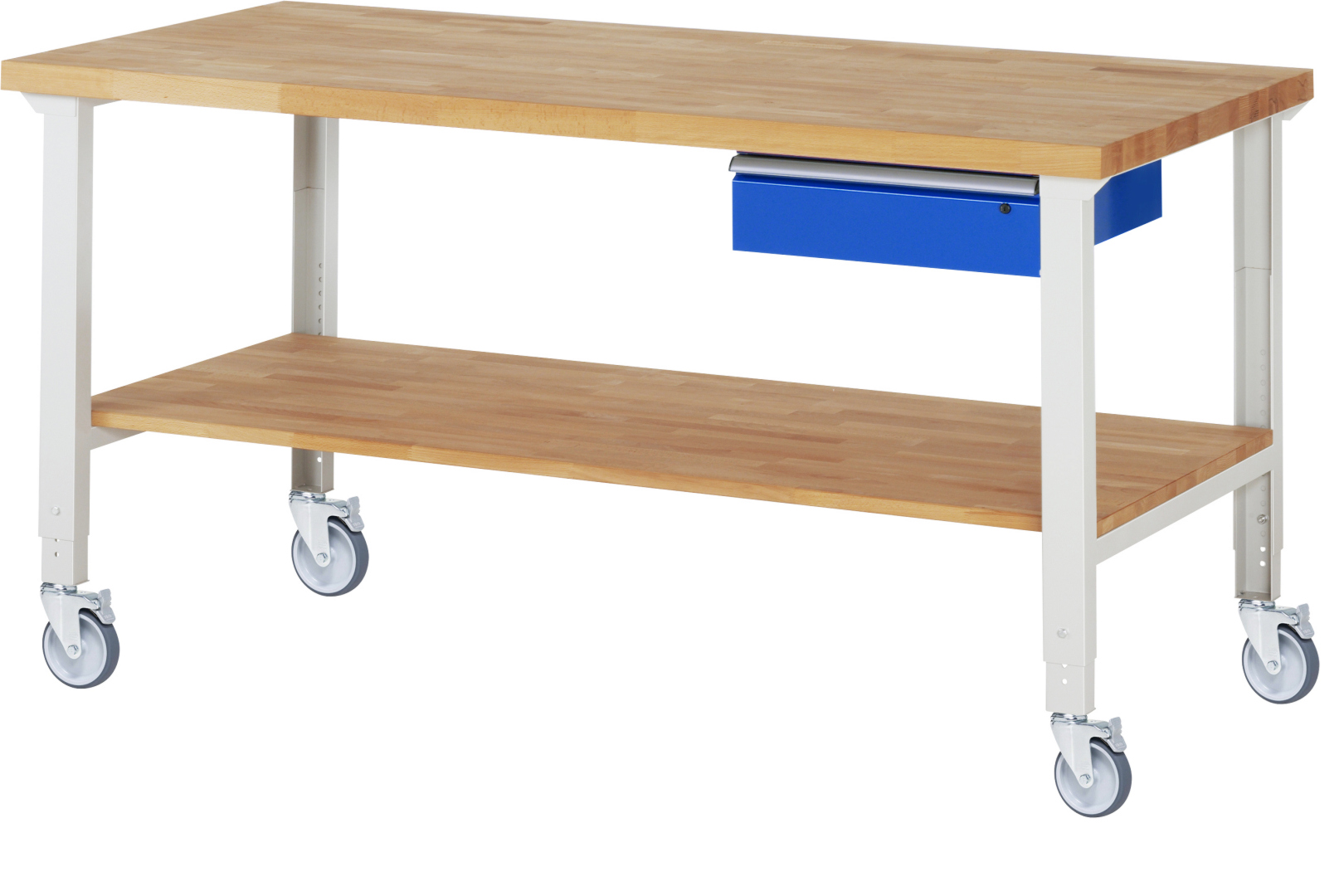 Fahrbare Werkbank Modell 7001 schwarz, BxTxH 2000x900x950-1000 mm, Buche-Massiv Arbeitsplatte 40 mm, 1 Schublade mit Auszug 90 %