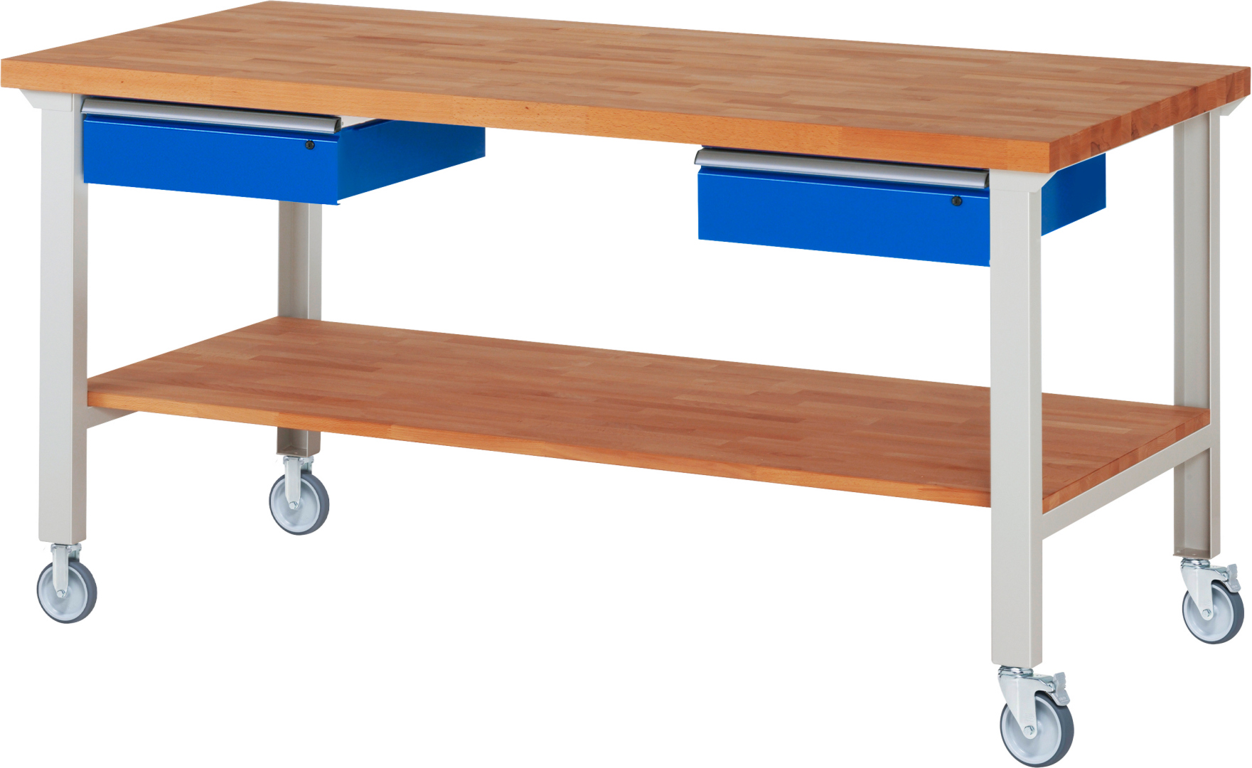 Fahrbare Werkbank Modell 7002 schwarz, BxTxH 2000x900x1000 mm, Buche-Massiv Arbeitsplatte 40 mm, 2 Schubladen mit Auszug 90 %