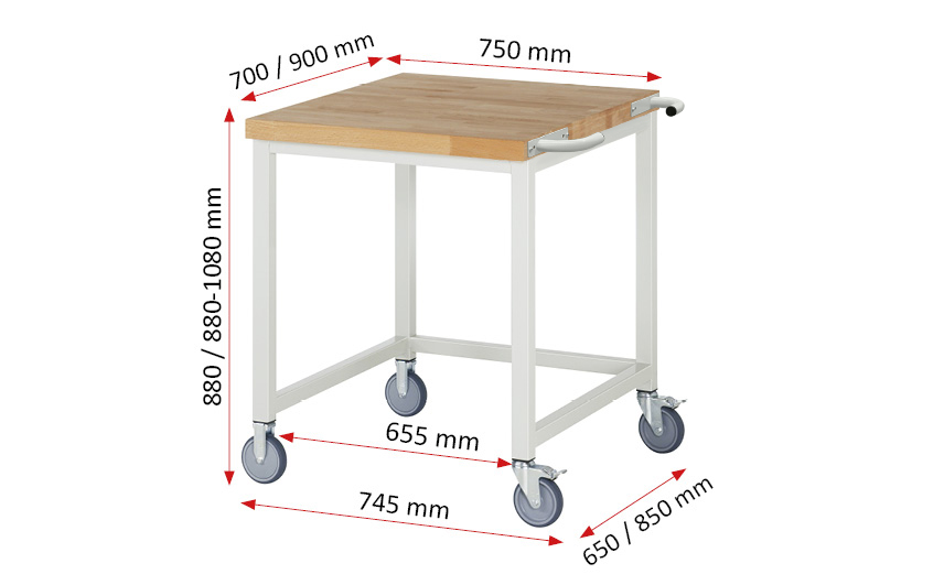 Fahrbare Werkbank Modell 8000 schwarz, BxTxH 750x900x880-1080 mm, Buche-Massiv Arbeitsplatte 40 mm