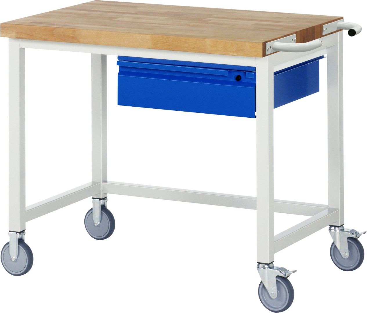 - Robustes Schweißgestell mit vier Füßen – bestehend aus zwei Fußpaaren aus Profil-Stahlrohr (45 x 45 x 2 mm). Mit Tiefenverstrebungen oben und unten für erhöhte Standfestigkeit. Gestellfüße mit 2 Bock- und 2 Lenkrollen mit Feststeller (Rollendurchmesser 125 mm, Bauhöhe 150 mm, Laufbelag aus thermoplastischem Gummi (grau, spurlos, 85° Shore), Radkörper aus Polypropylen). Bockrollen sind an der linken Seite, Lenkrollen mit Feststeller an der rechten Seite montiert (Expanderbefestigung). Querstreben aus C-Profil (40x40x2 mm) oben unter der Arbeitsplatte (vorne, hinten) sowie unten (hinten).