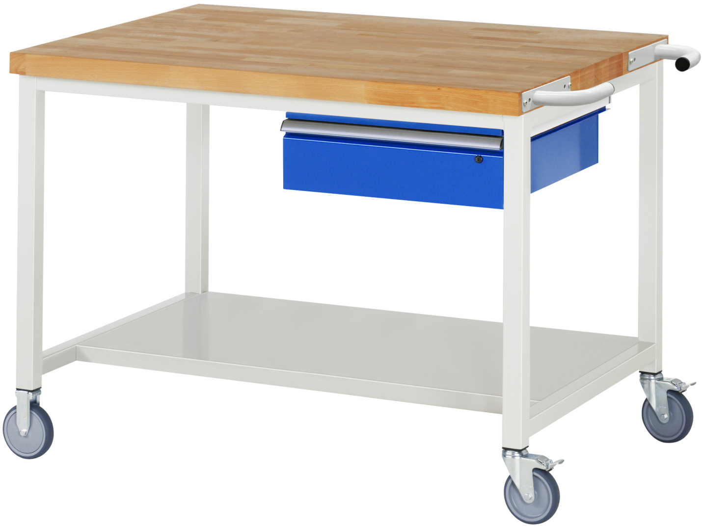 Fahrbare Werkbank Modell 8001 schwarz, BxTxH 1250x900x880 mm, Buche-Massiv Arbeitsplatte 40 mm, 1 Schublade mit Auszug 90 %