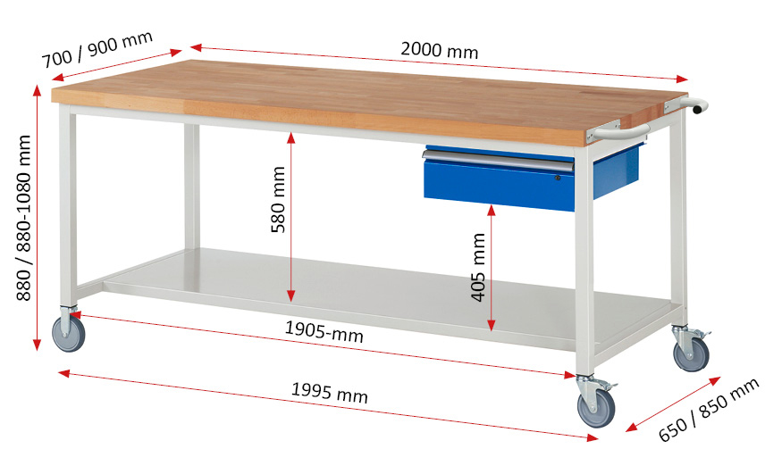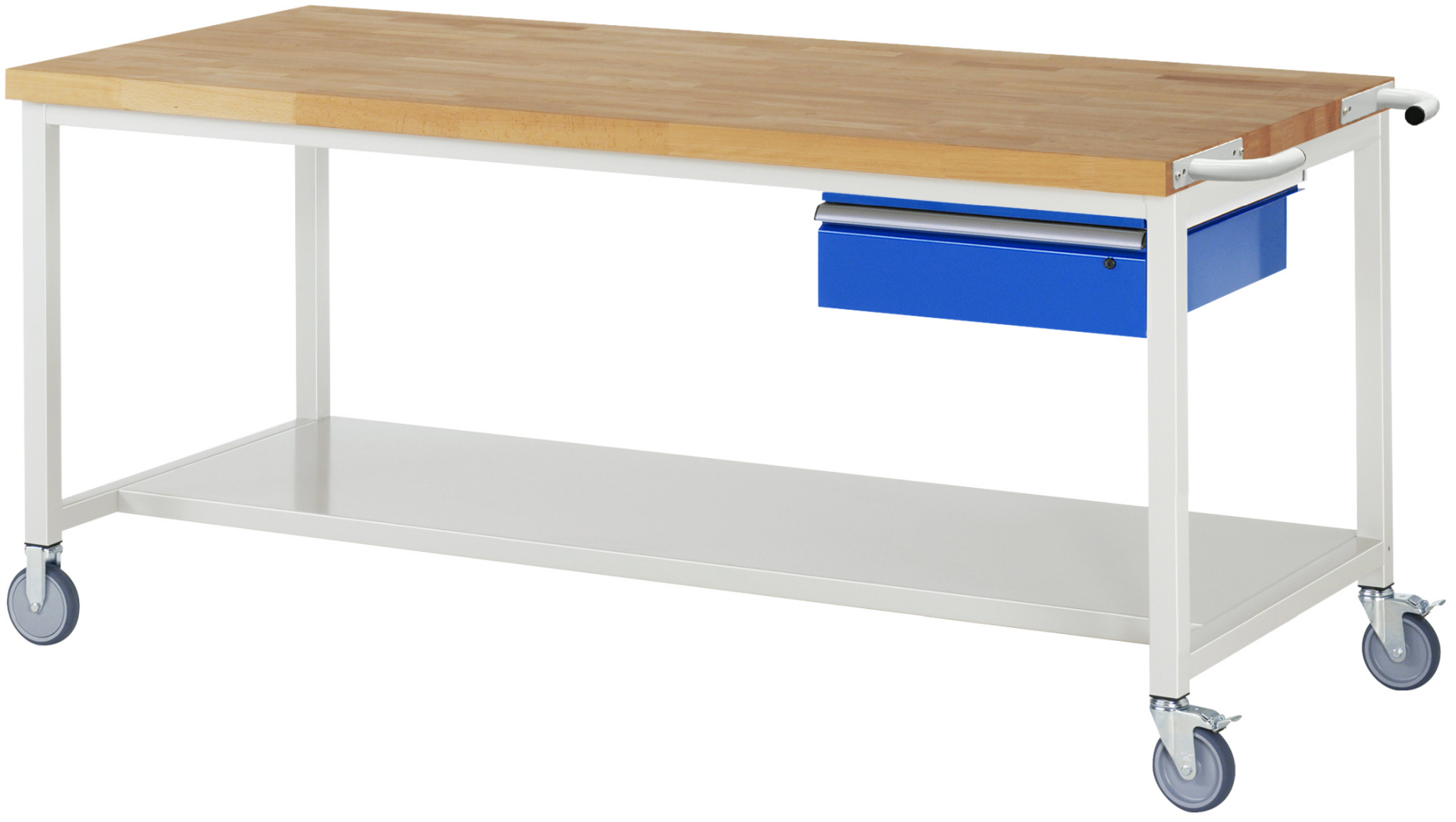 Fahrbare Werkbank Modell 8001 schwarz, BxTxH 2000x900x880-1080 mm, Buche-Massiv Arbeitsplatte 40 mm, 1 Schublade mit Auszug 90 %