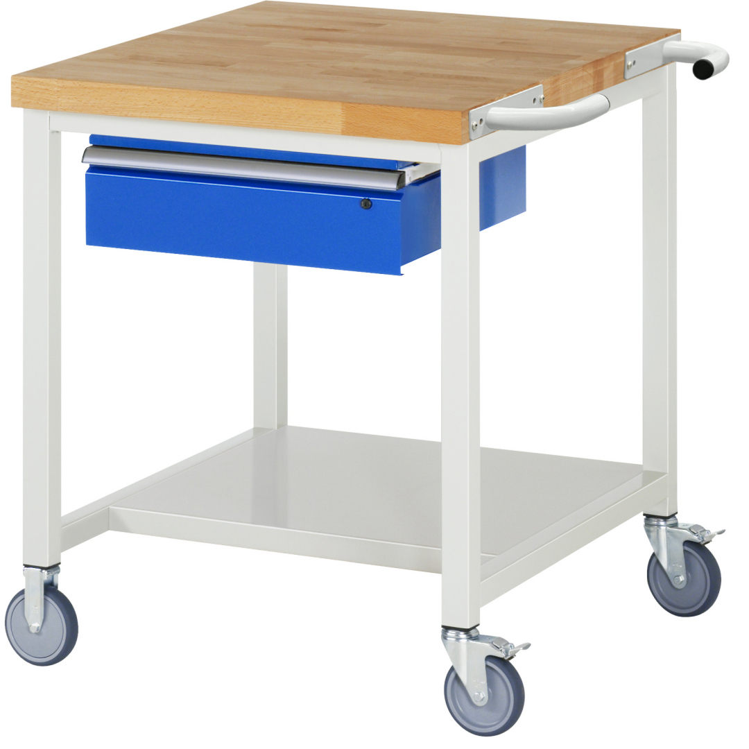 Fahrbare Werkbank Modell 8001 schwarz, BxTxH 750x900x880-1080 mm, Buche-Massiv Arbeitsplatte 40 mm, 1 Schublade mit Auszug 90 %