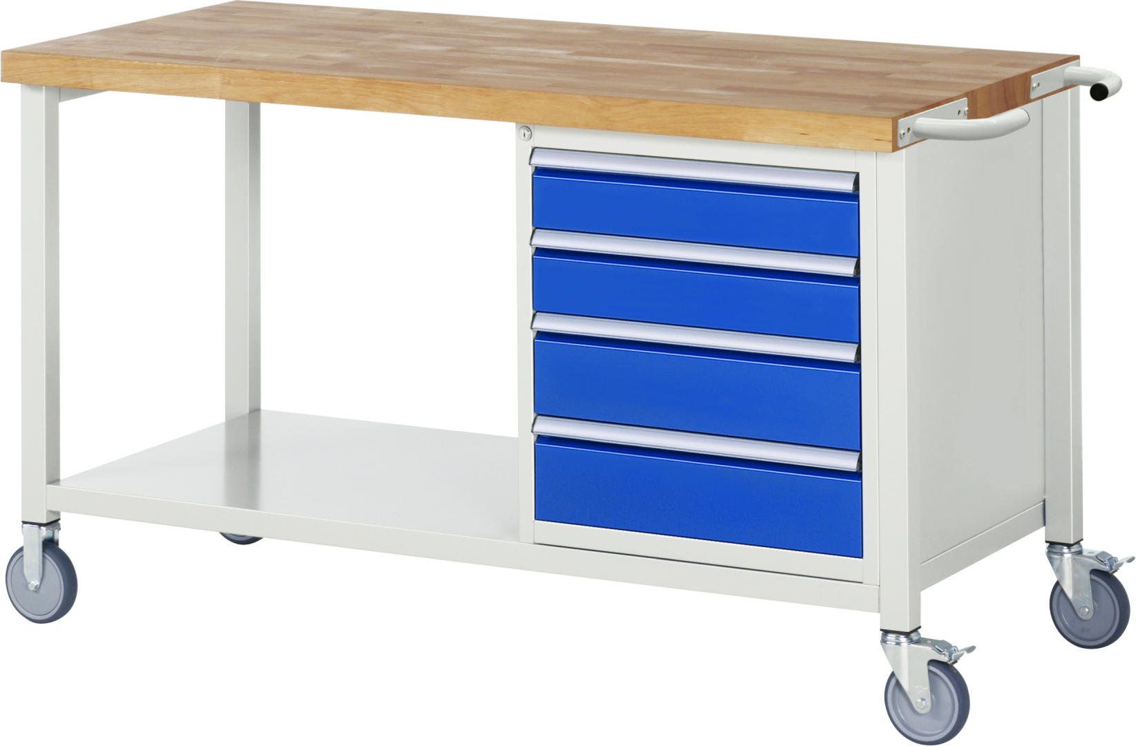 - Robustes Schweißgestell mit vier Füßen – bestehend aus zwei Fußpaaren aus Profil-Stahlrohr (45 x 45 x 2 mm). Mit Tiefenverstrebungen oben und unten für erhöhte Standfestigkeit. Gestellfüße mit 2 Bock- und 2 Lenkrollen mit Feststeller (Rollendurchmesser 125 mm, Bauhöhe 150 mm, Laufbelag aus thermoplastischem Gummi (grau, spurlos, 85° Shore), Radkörper aus Polypropylen). Bockrollen sind an der linken Seite, Lenkrollen mit Feststeller an der rechten Seite montiert (Expanderbefestigung). Ablageboden unten (Tiefe 650 mm hinten bündig mit Systemunterbau, Fachhöhe 620 mm).
