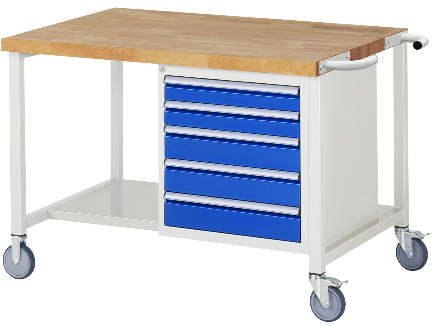 Fahrbare Werkbank Modell 8171 schwarz, BxTxH 1250x900x880-1080 mm, Buche-Massiv Arbeitsplatte 40 mm, 5 Schubladen mit Auszug 90 %