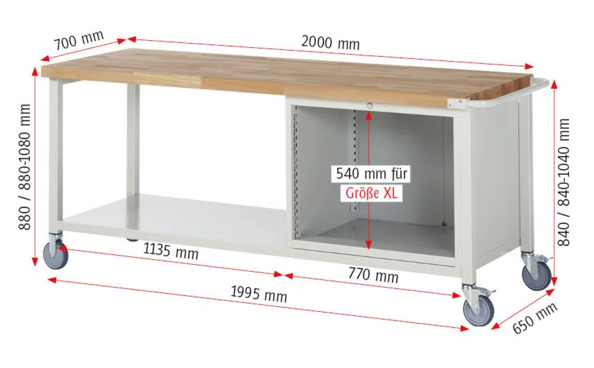 - Robustes Schweißgestell mit vier Füßen – bestehend aus zwei Fußpaaren aus Profil-Stahlrohr (45 x 45 x 2 mm). Mit Tiefenverstrebungen oben und unten für erhöhte Standfestigkeit. Gestellfüße mit 2 Bock- und 2 Lenkrollen mit Feststeller (Rollendurchmesser 125 mm, Bauhöhe 150 mm, Laufbelag aus thermoplastischem Gummi (grau, spurlos, 85° Shore), Radkörper aus Polypropylen). Bockrollen sind an der linken Seite, Lenkrollen mit Feststeller an der rechten Seite montiert (Expanderbefestigung).Ablageboden unten (Tiefe 650 mm hinten bündig mit Systemunterbau, Fachhöhe 620 mm).