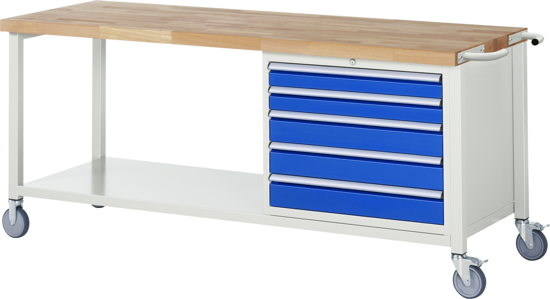 Fahrbare Werkbank Modell 8271 schwarz-rot, BxTxH 2000x700x880-1080 mm, Buche-Massiv Arbeitsplatte 40 mm, 5 Schubladen mit Vollauszug 100 % und SoftClosing