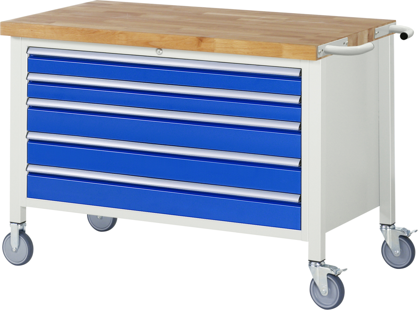 Fahrbare Werkbank Modell 8371 schwarz-rot, BxTxH 1250x700x880 mm, Buche-Massiv Arbeitsplatte 40 mm, 5 Schubladen mit Auszug 90 %