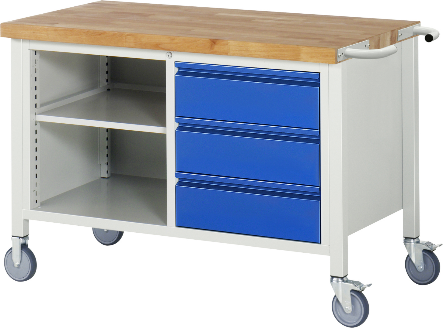 Fahrbare Werkbank - Modell 8462 BASIC schwarz-rot, BxTxH 1250x700x880 mm, Buche-Massiv Arbeitsplatte 40 mm, 3 Schubladen mit Auszug 90 %