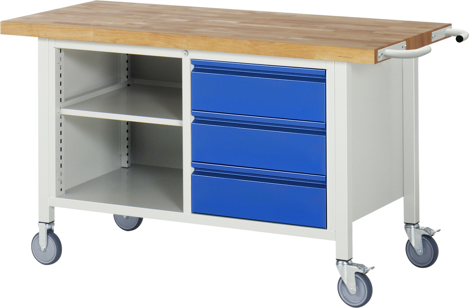 Fahrbare Werkbank - Modell 8462 BASIC schwarz-rot, BxTxH 1500x700x880 mm, Buche-Massiv Arbeitsplatte 40 mm, 3 Schubladen mit Auszug 90 %