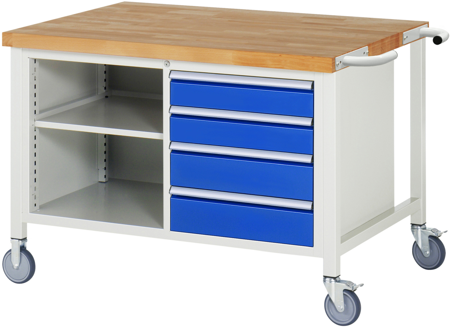 Fahrbare Werkbank Modell 8463 schwarz, BxTxH 1250x900x880 mm, Buche-Massiv Arbeitsplatte 40 mm, 4 Schubladen mit Auszug 90 %