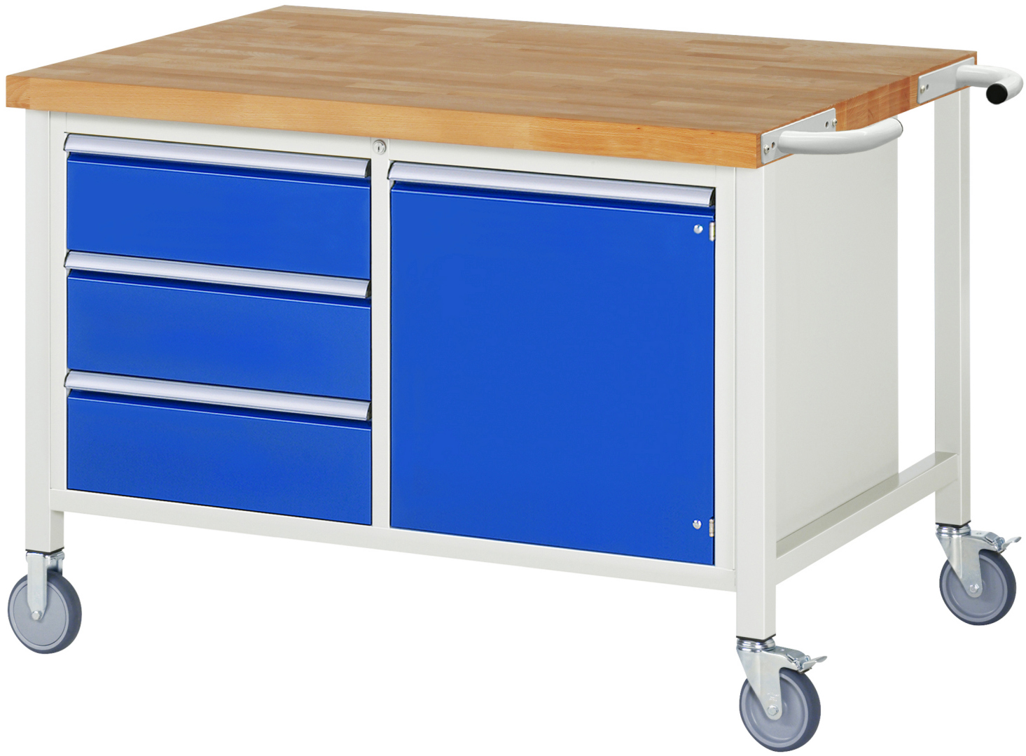 Fahrbare Werkbank Modell 8468 schwarz, BxTxH 1250x900x880-1080 mm, Buche-Massiv Arbeitsplatte 40 mm, 3 Schubladen mit Vollauszug 100 % und SoftClosing
