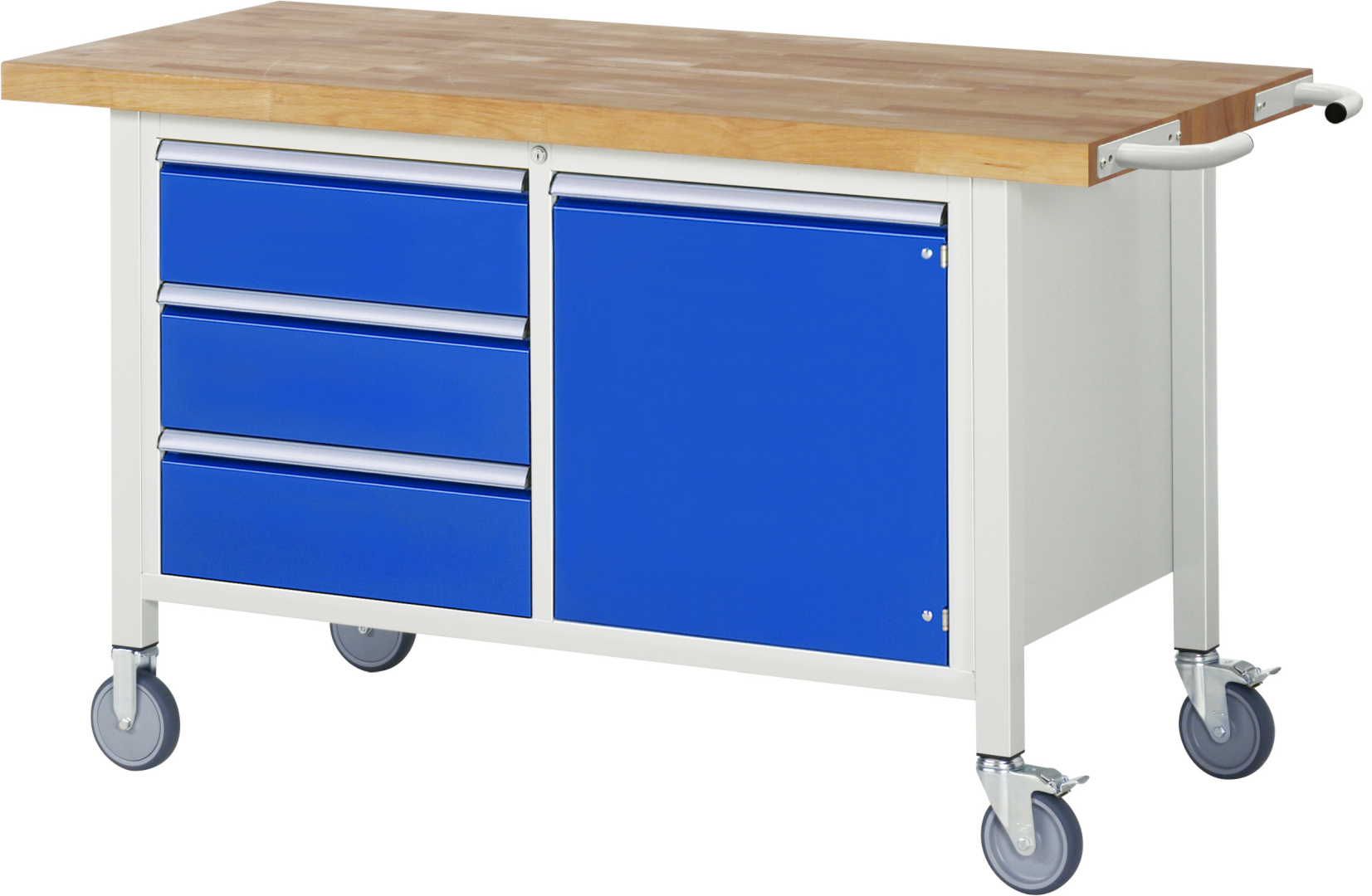 Fahrbare Werkbank Modell 8468 schwarz, BxTxH 1500x700x880 mm, Buche-Massiv Arbeitsplatte 40 mm, 3 Schubladen mit Auszug 90 %