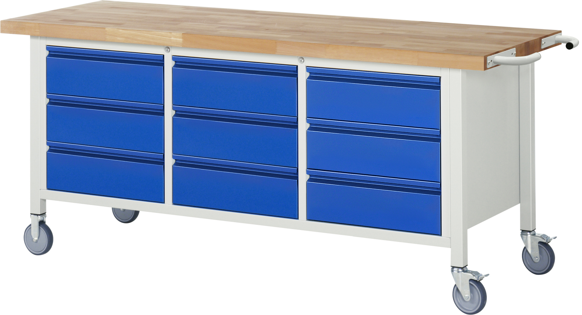 Fahrbare Werkbank - Modell 8574 BASIC schwarz-rot, BxTxH 2000x700x880 mm, Buche-Massiv Arbeitsplatte 40 mm, 9 Schubladen mit Auszug 90 %