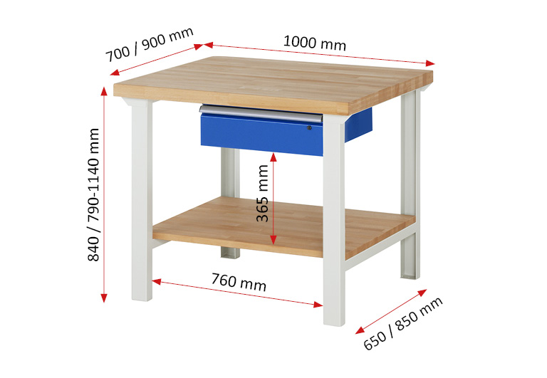 Werkbank Modell 7001 schwarz-rot, BxTxH 1000x700x790-1140 mm, Buche-Massiv Arbeitsplatte 40 mm, 1 Schublade mit Auszug 90 %