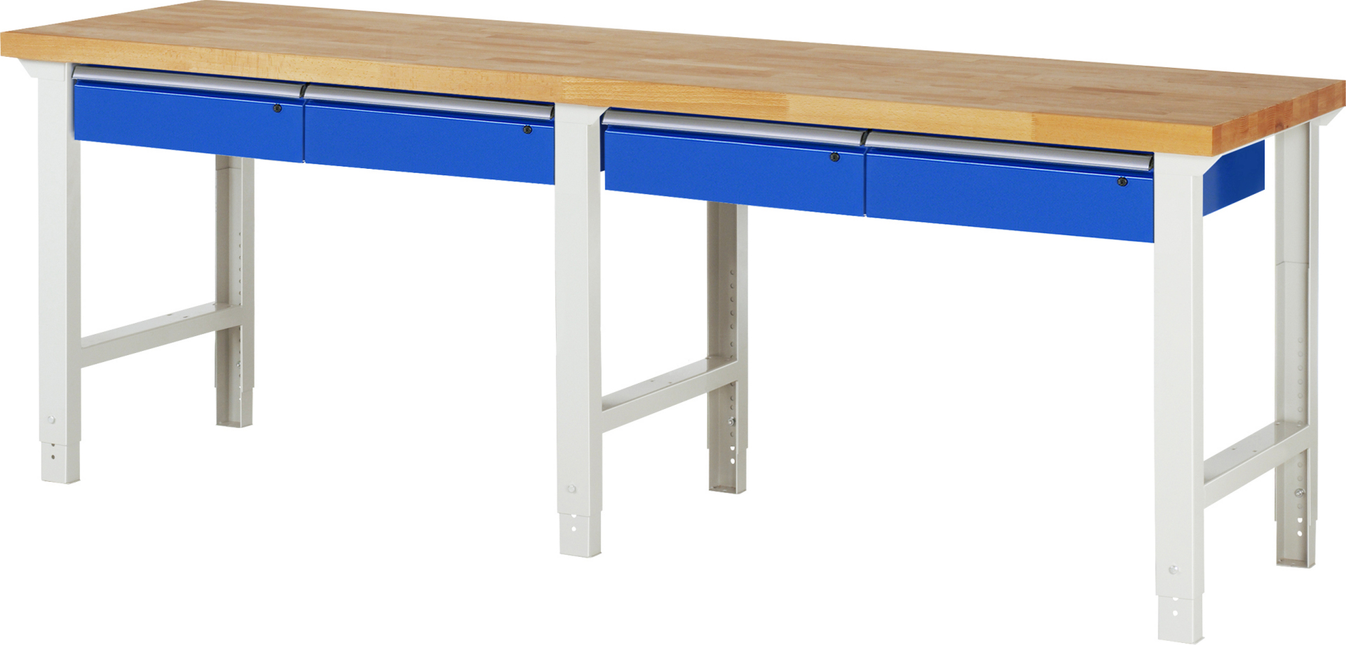 Werkbank Modell 7002 schwarz-rot, BxTxH 2500x700x790-1140 mm, Buche-Massiv Arbeitsplatte 40 mm, 4 Schubladen mit Auszug 90 %