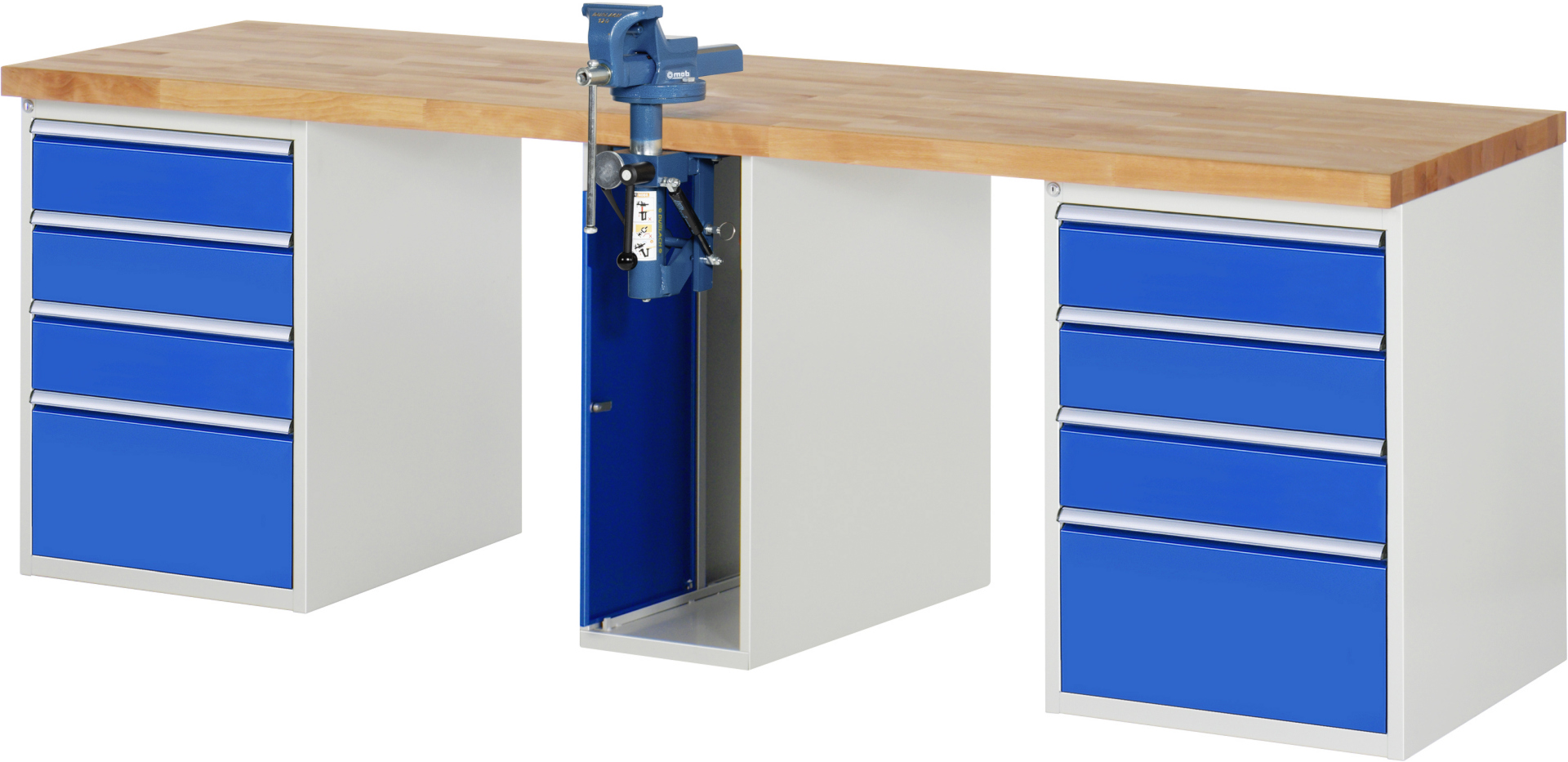 Werkbank Modell 7510 rot, BxTxH 2500x700x840 mm, Buche-Massiv Arbeitsplatte 40 mm, 8 Schubladen mit Auszug 90 %