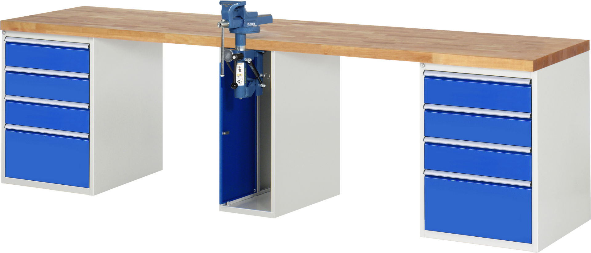 Werkbank Modell 7510 schwarz, BxTxH 3000x700x840 mm, Buche-Massiv Arbeitsplatte 40 mm, 8 Schubladen mit Vollauszug 100 % und SoftClosing