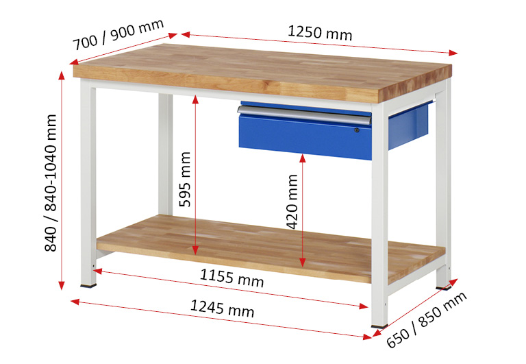Werkbank Modell 8001 schwarz-rot, BxTxH 1250x900x840-1040 mm, Buche-Massiv Arbeitsplatte 40 mm, 1 Schublade mit Auszug 90 %