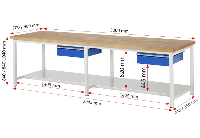 Werkbank Modell 8001 schwarz-rot, BxTxH 3000x700x840 mm, Buche-Massiv Arbeitsplatte 40 mm, 2 Schubladen mit Auszug 90 %