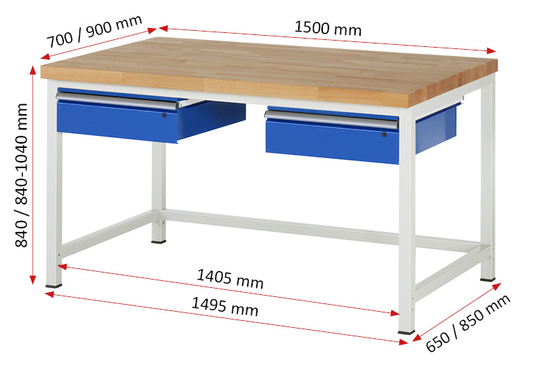 Werkbank Modell 8002, BxTxH 1500x900x840-1040 mm, Buche-Massiv Arbeitsplatte 40 mm, 2 Schubladen mit Auszug 90 %