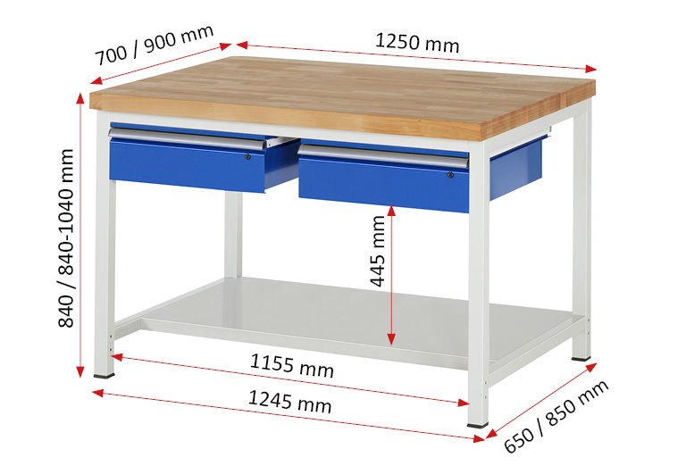 Werkbank Modell 8002 schwarz, BxTxH 1250x700x840-1040 mm, Buche-Massiv Arbeitsplatte 40 mm, 2 Schubladen mit Auszug 90 %