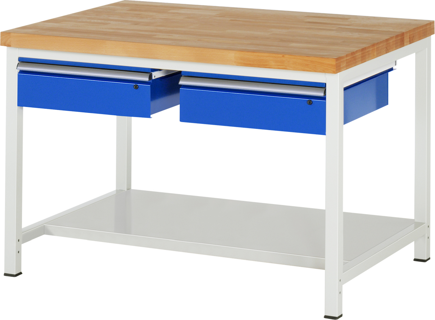 Werkbank Modell 8002 schwarz, BxTxH 1250x900x840-1040 mm, Buche-Massiv Arbeitsplatte 40 mm, 2 Schubladen mit Auszug 90 %