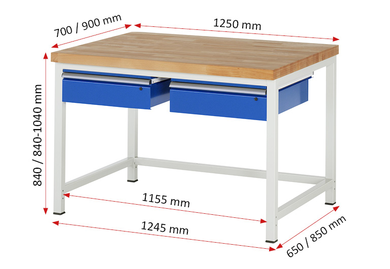 Werkbank Modell 8002 schwarz-rot, BxTxH 1250x700x840-1040 mm, Buche-Massiv Arbeitsplatte 40 mm, 2 Schubladen mit Auszug 90 %