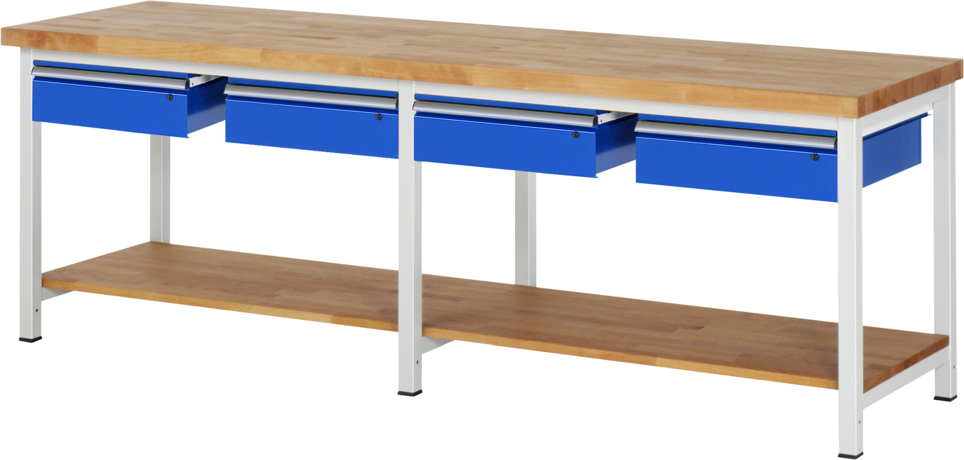 Werkbank Modell 8002 schwarz-rot, BxTxH 2500x700x840-1040 mm, Buche-Massiv Arbeitsplatte 40 mm, 4 Schubladen mit Auszug 90 %