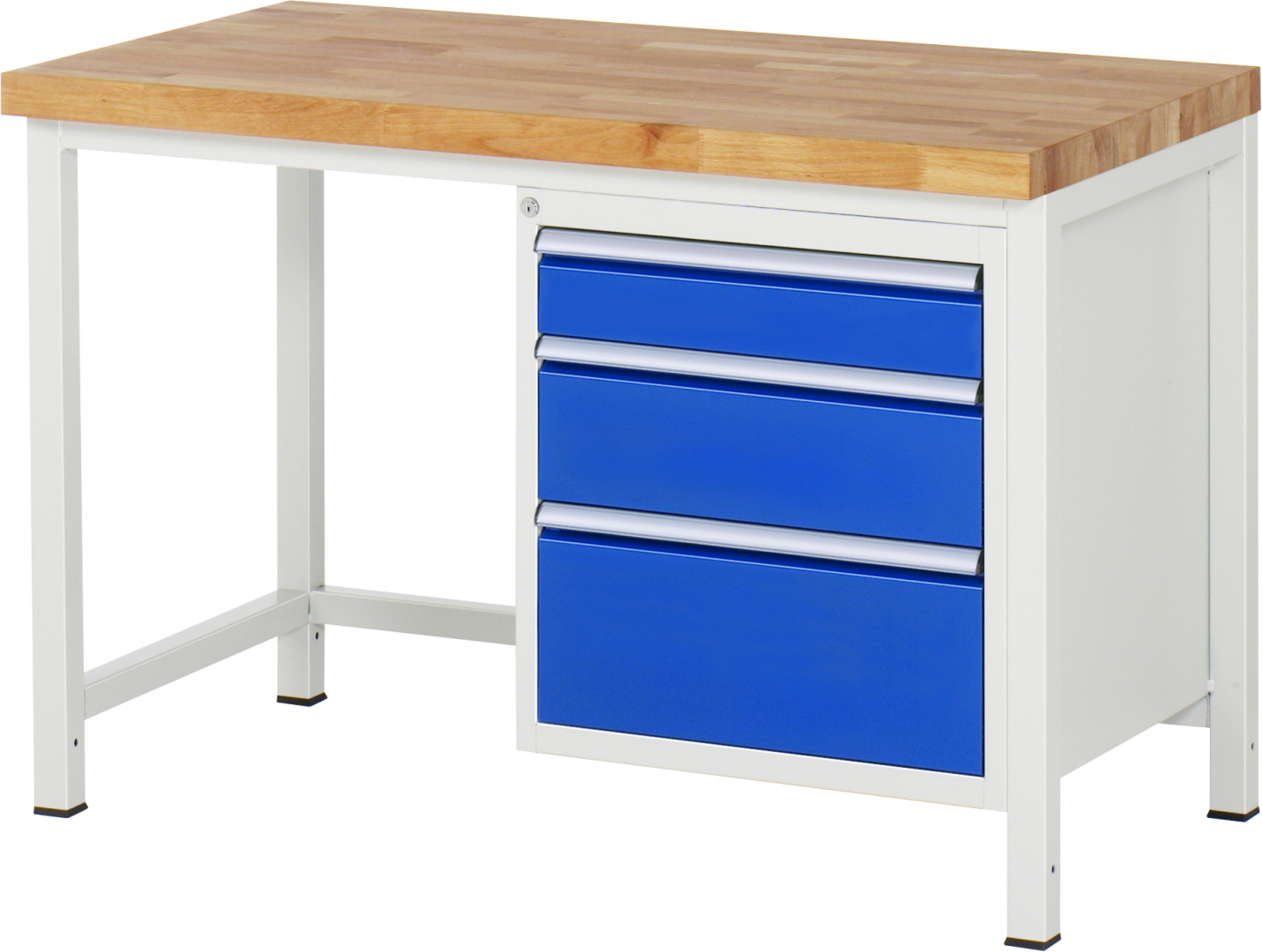 Werkbank Modell 8159 schwarz, BxTxH 1250x700x840-1040 mm, Buche-Massiv Arbeitsplatte 40 mm, 3 Schubladen mit Vollauszug 100 % und SoftClosing
