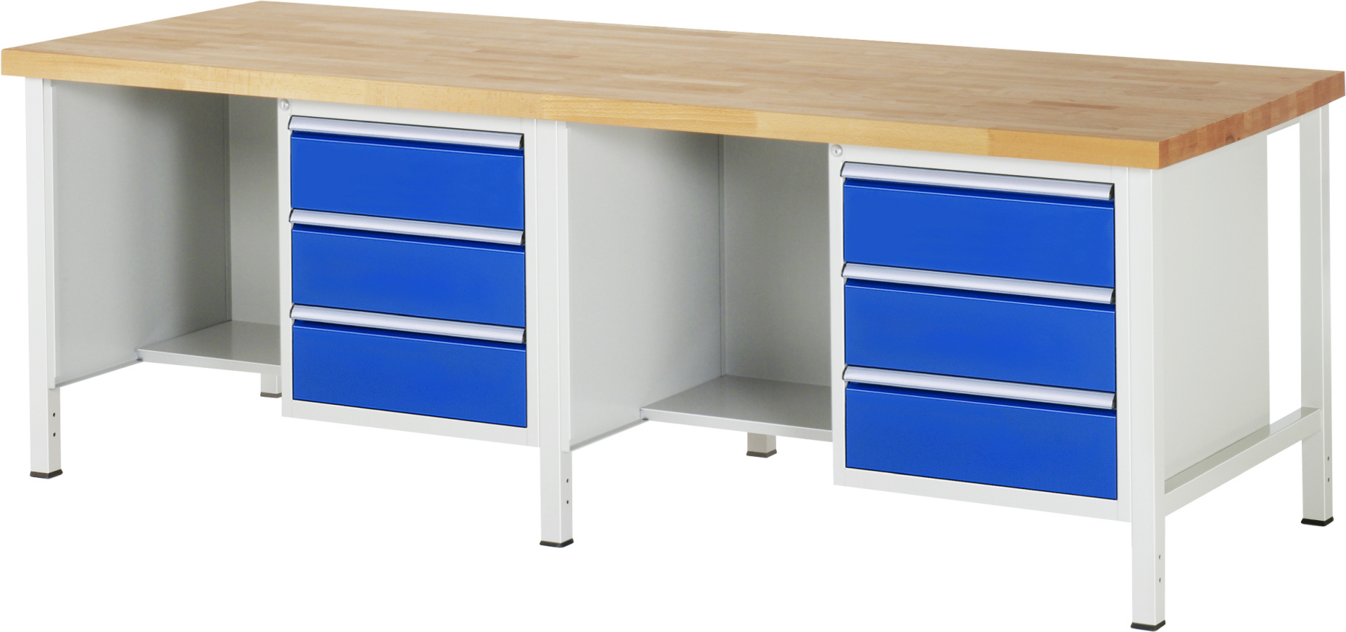 Werkbank Modell 8452 schwarz-rot, BxTxH 2500x900x840-1040 mm, Buche-Massiv Arbeitsplatte 40 mm, 6 Schubladen mit Auszug 90 %
