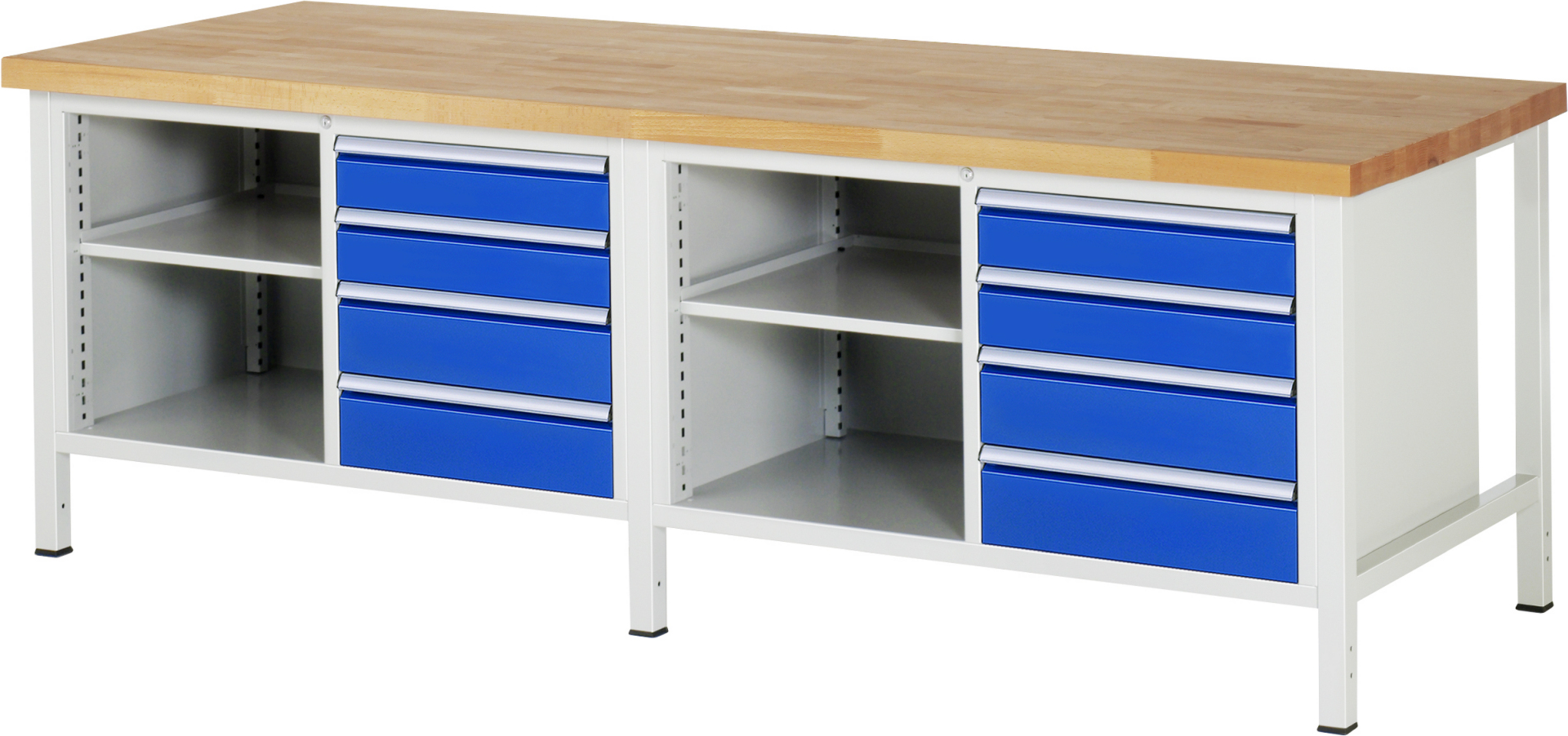 Werkbank Modell 8463 schwarz-rot, BxTxH 2500x900x840-1040 mm, Buche-Massiv Arbeitsplatte 40 mm, 8 Schubladen mit Auszug 90 %