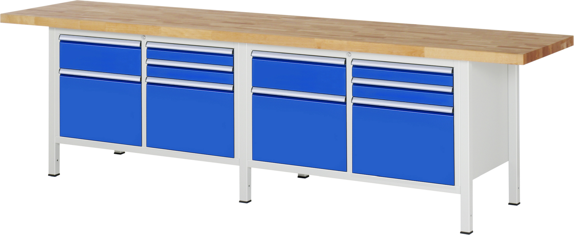 Werkbank Modell 8472 schwarz-rot, BxTxH 3000x700x840 mm, Buche-Massiv Arbeitsplatte 40 mm, 10 Schubladen mit Auszug 90 %