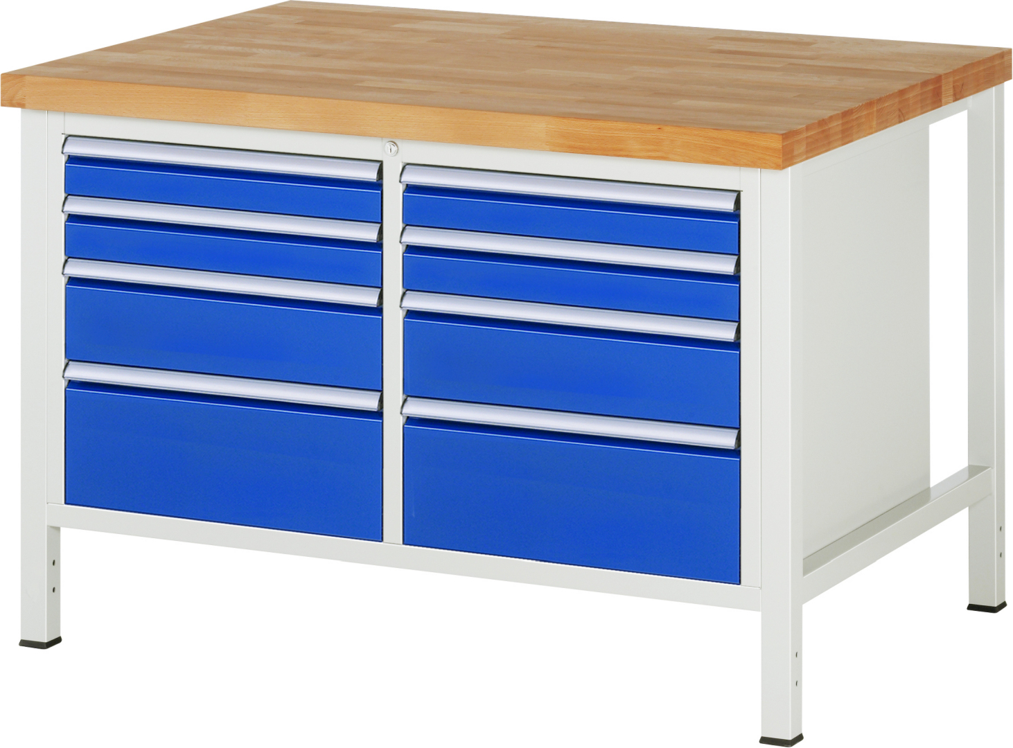 Werkbank Modell 8478 schwarz-rot, BxTxH 1250x900x840-1040 mm, Buche-Massiv Arbeitsplatte 40 mm, 8 Schubladen mit Vollauszug 100 % und SoftClosing