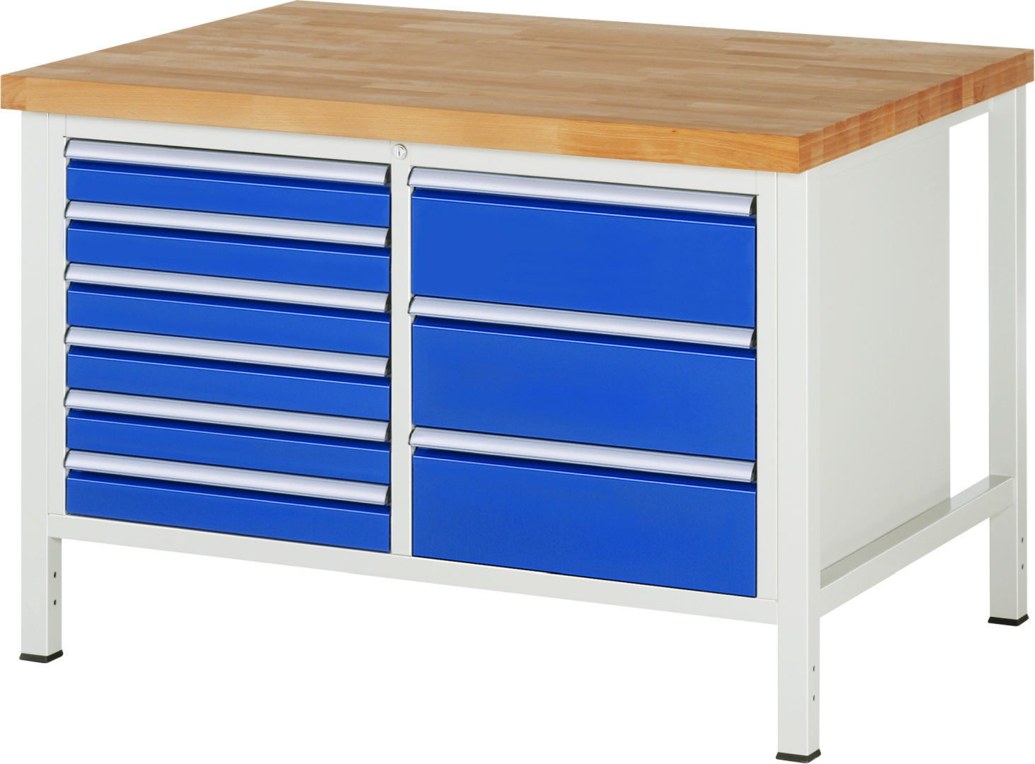 Werkbank Modell 8479 schwarz-rot, BxTxH 1250x900x840 mm, Buche-Massiv Arbeitsplatte 40 mm, 9 Schubladen mit Auszug 90 %