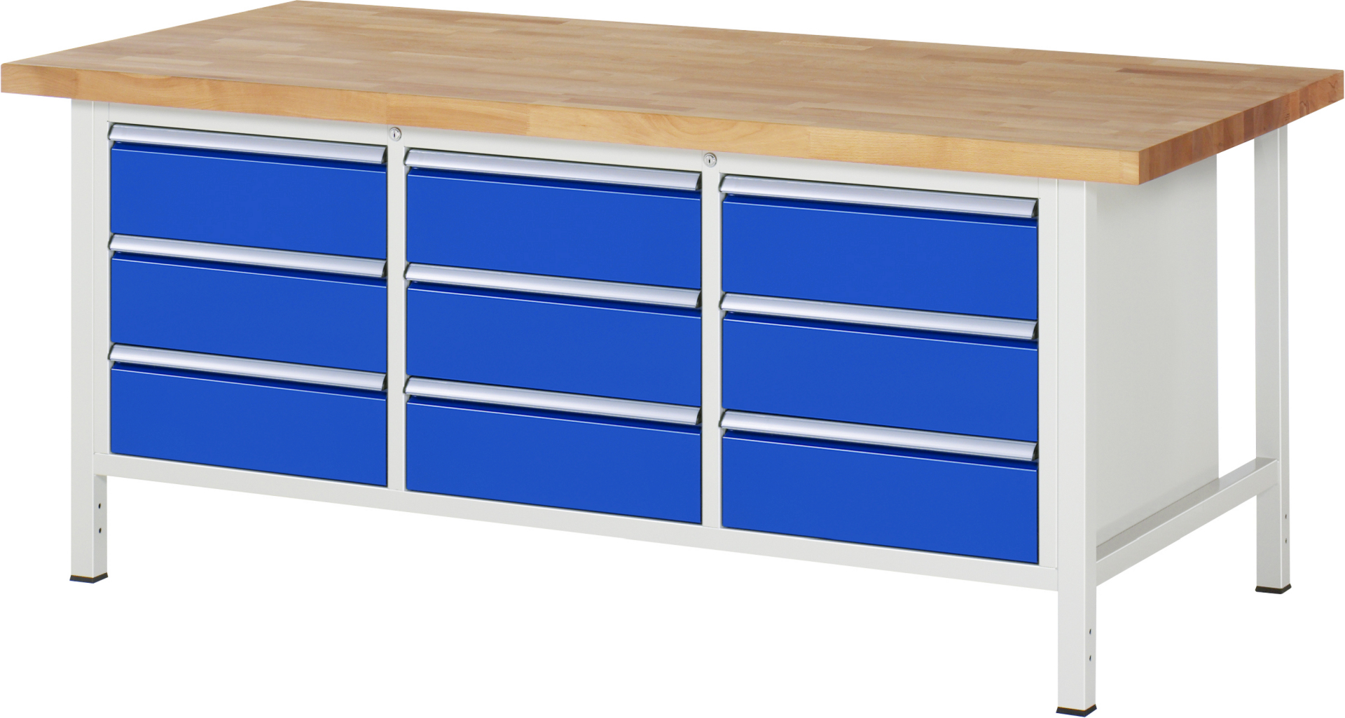 Werkbank Modell 8574 schwarz-rot, BxTxH 2000x900x840-1040 mm, Buche-Massiv Arbeitsplatte 40 mm, 9 Schubladen mit Vollauszug 100 % und SoftClosing