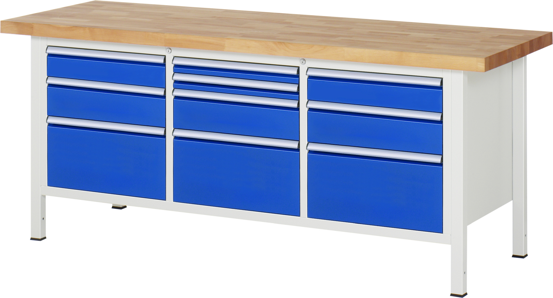 Werkbank Modell 8576 schwarz-rot, BxTxH 2000x700x840-1040 mm, Buche-Massiv Arbeitsplatte 40 mm, 10 Schubladen mit Vollauszug 100 % und SoftClosing
