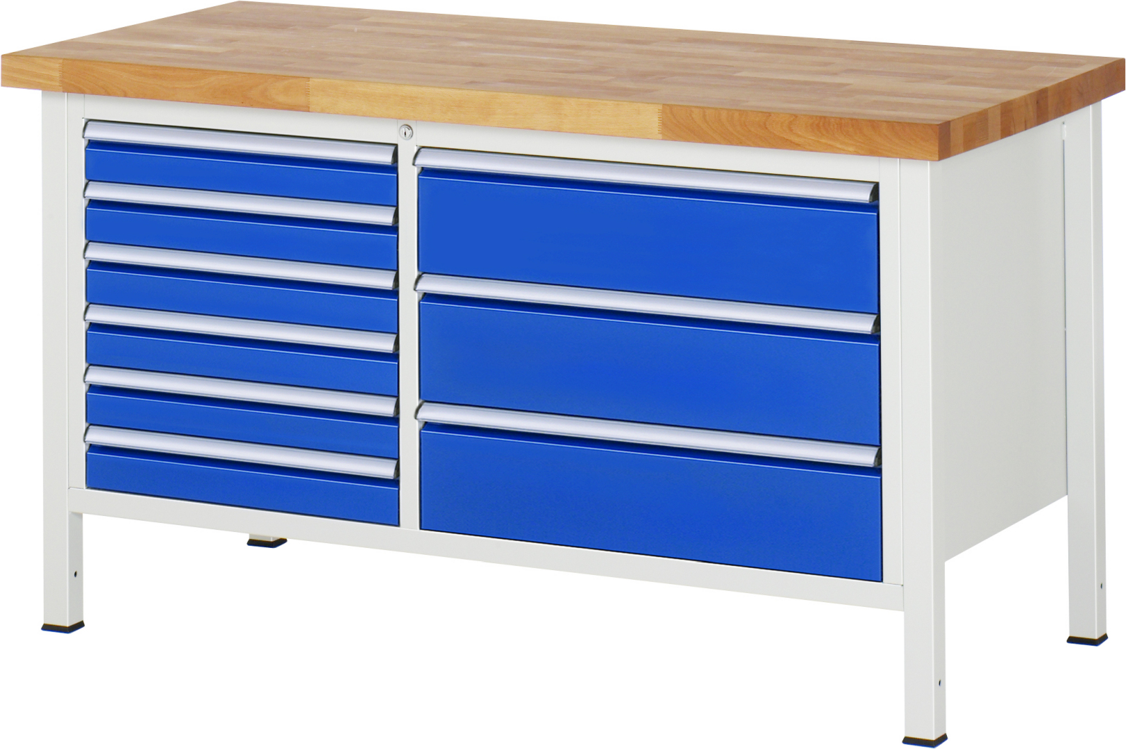 Werkbank Modell 8653 schwarz, BxTxH 1500x700x840 mm, Buche-Massiv Arbeitsplatte 40 mm, 9 Schubladen mit Vollauszug 100 % und SoftClosing