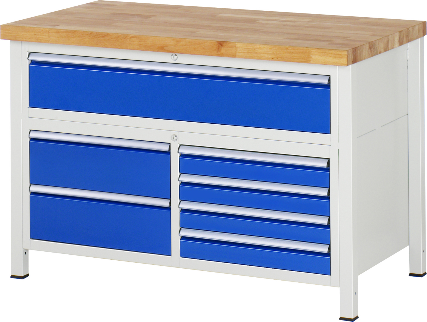 Werkbank Modell 8921 schwarz-rot, BxTxH 1250x700x840 mm, Buche-Massiv Arbeitsplatte 40 mm, 7 Schubladen mit Vollauszug 100 % und SoftClosing