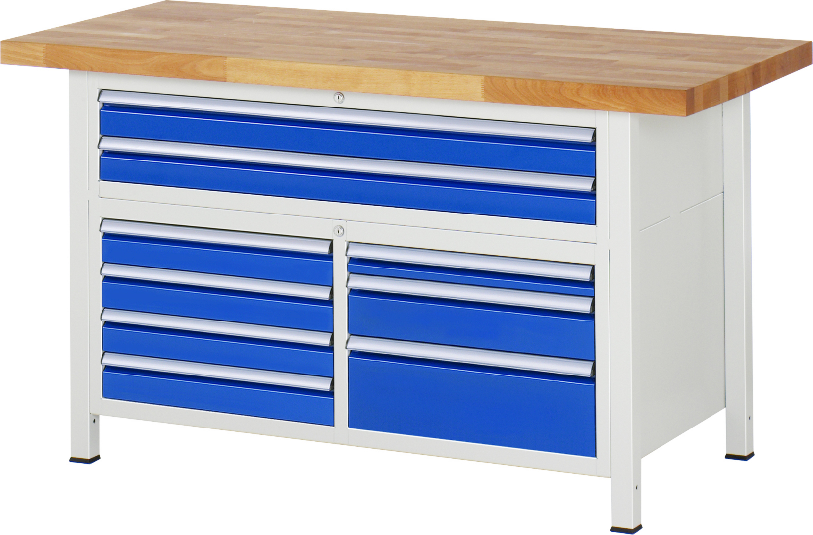 Werkbank Modell 8923 schwarz, BxTxH 1500x700x840-1040 mm, Buche-Massiv Arbeitsplatte 40 mm, 9 Schubladen mit Vollauszug 100 % und SoftClosing