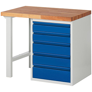 Werkbank schwarz-rot, BxTxH 1000xT700xH890 mm, Platte Buche 40 mm 40 mm, 5 Schubladen: 2x120, 2x150, 1x180 mm, RAL 9011/3000