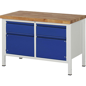Werkbank schwarz-rot, BxTxH 1250x700x840-1040 mm, Platte Buche 40 mm, 2 Schubladen 180 mm, 2 Türen 360 mm, RAL 9011/3000