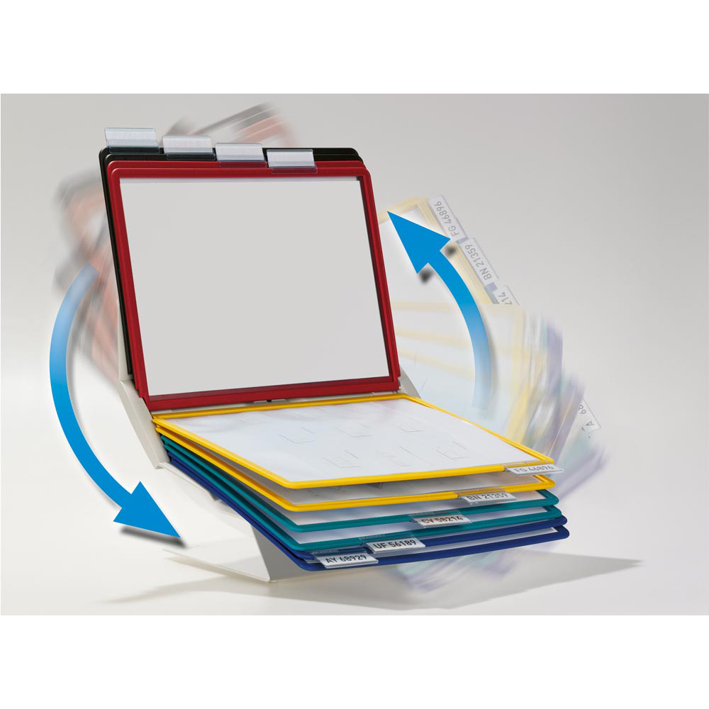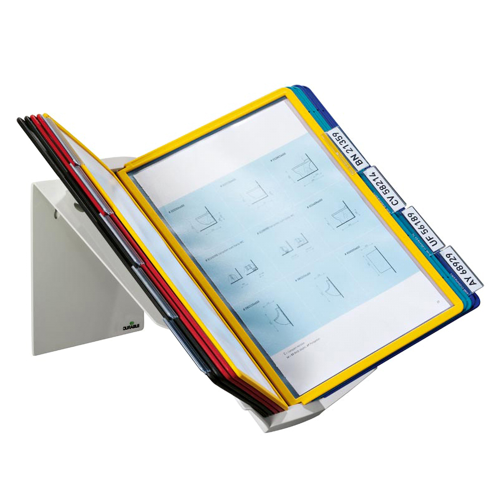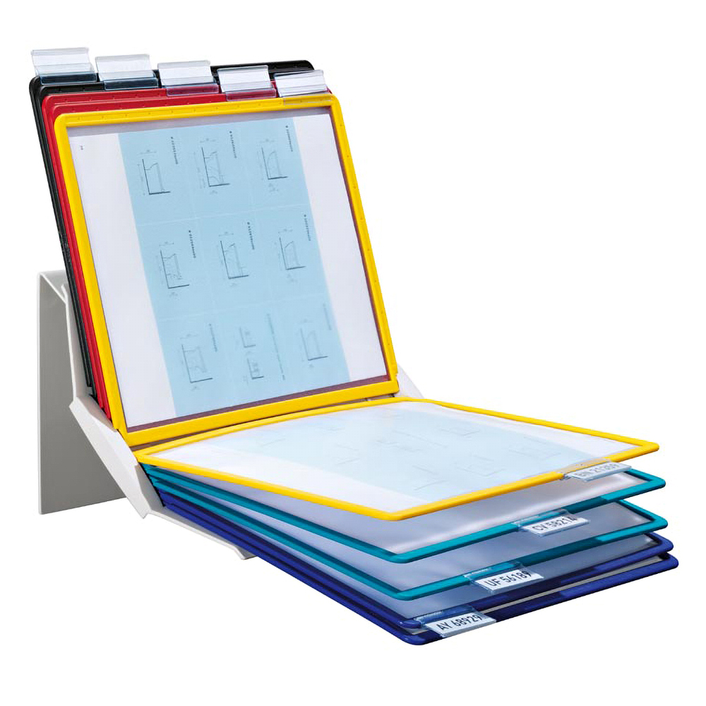 · Im Hoch- und Querformat einsetzbar, da um 90° drehbar · Hochwertiger Ständer aus Metall · Inkl. Befestigungsmaterial · Mit 10 Sichttafeln DIN A4 aus Polypropylen inkl. 10 Reiter mit blanko Einsteckschilder, 58 mm breit ∙ Sichttafeln je 2 x in schwarz, rot, gelb, grün, dunkelblau