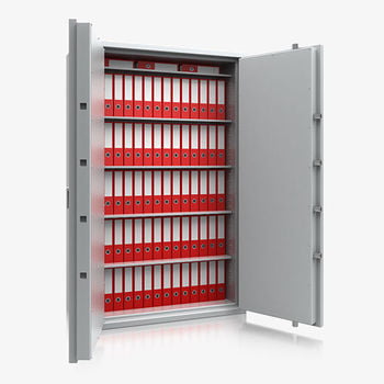 Der massive, mehrwandige Stahlkorpust ist allseitig mit hochfestem Spezialbeton befüllt. Die 114 mm starken Türen sind mit einer dreiseitigen Bolzenverriegelung sowie einem durchgehenden Hintergreifprofil an der Scharnierseite ausgestattet. Dank der außenliegenden Scharniere ergibt sich ein Türöffnungswinkel von 180 Grad.