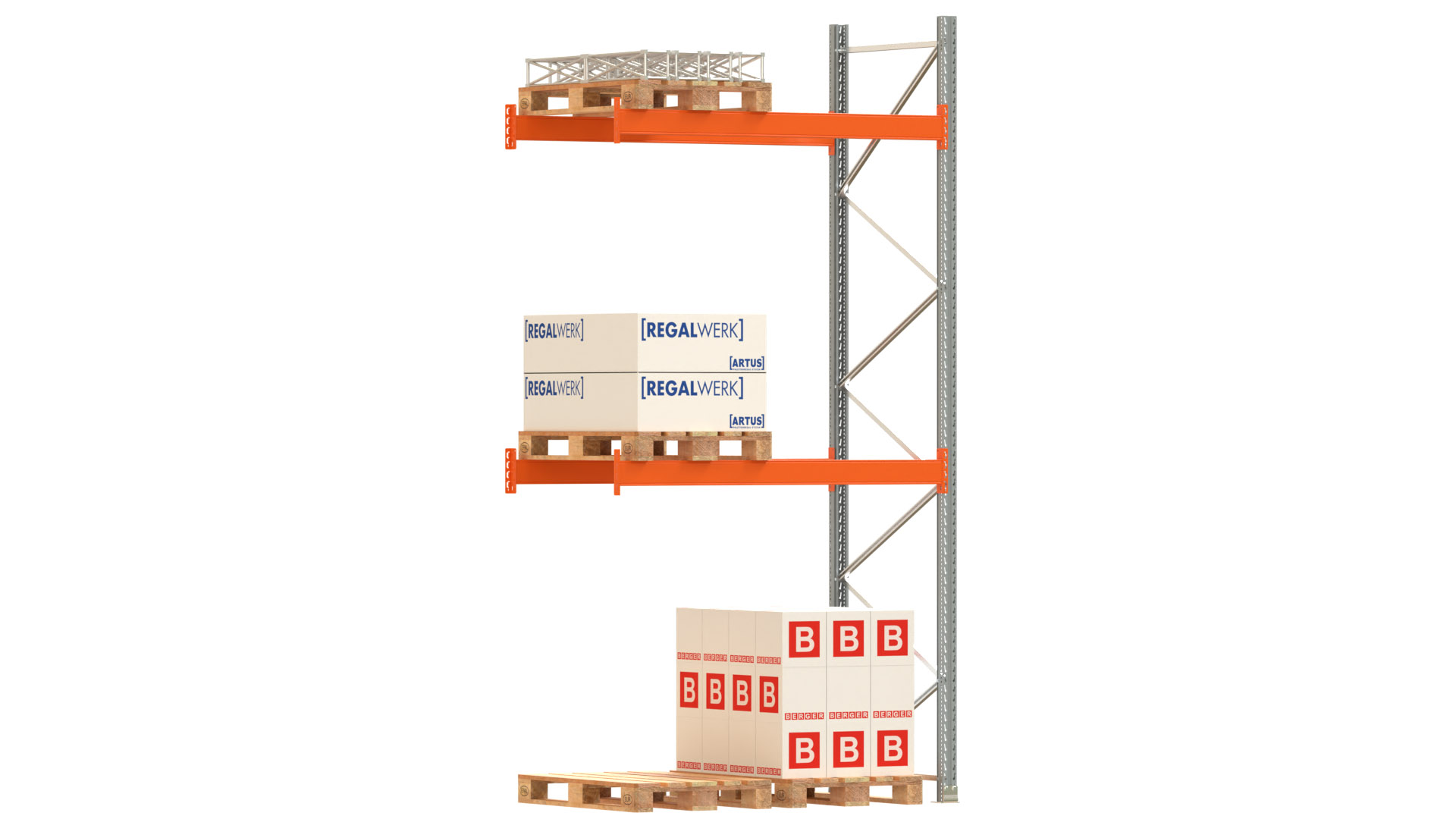 ARTUS-Palettenregal - Anbaufeld - 3800-2 HxBxT 4000 x 1985 x 1100 mm mit 2 x Ebenen Auflageträger Variante 1900-125/1,5 - RAL 2004 Stützrahmen NCS S 4005 (ähnlich - RAL 7001 silbergrau) (Ausfachung verzinkt) Fachlast: 3.000 kg Feldlast: 6.000 kg bei max. Fachhöhe von 1.750 mm jeweils bei gleichmässig verteilter Last inkl. Bolzenanker