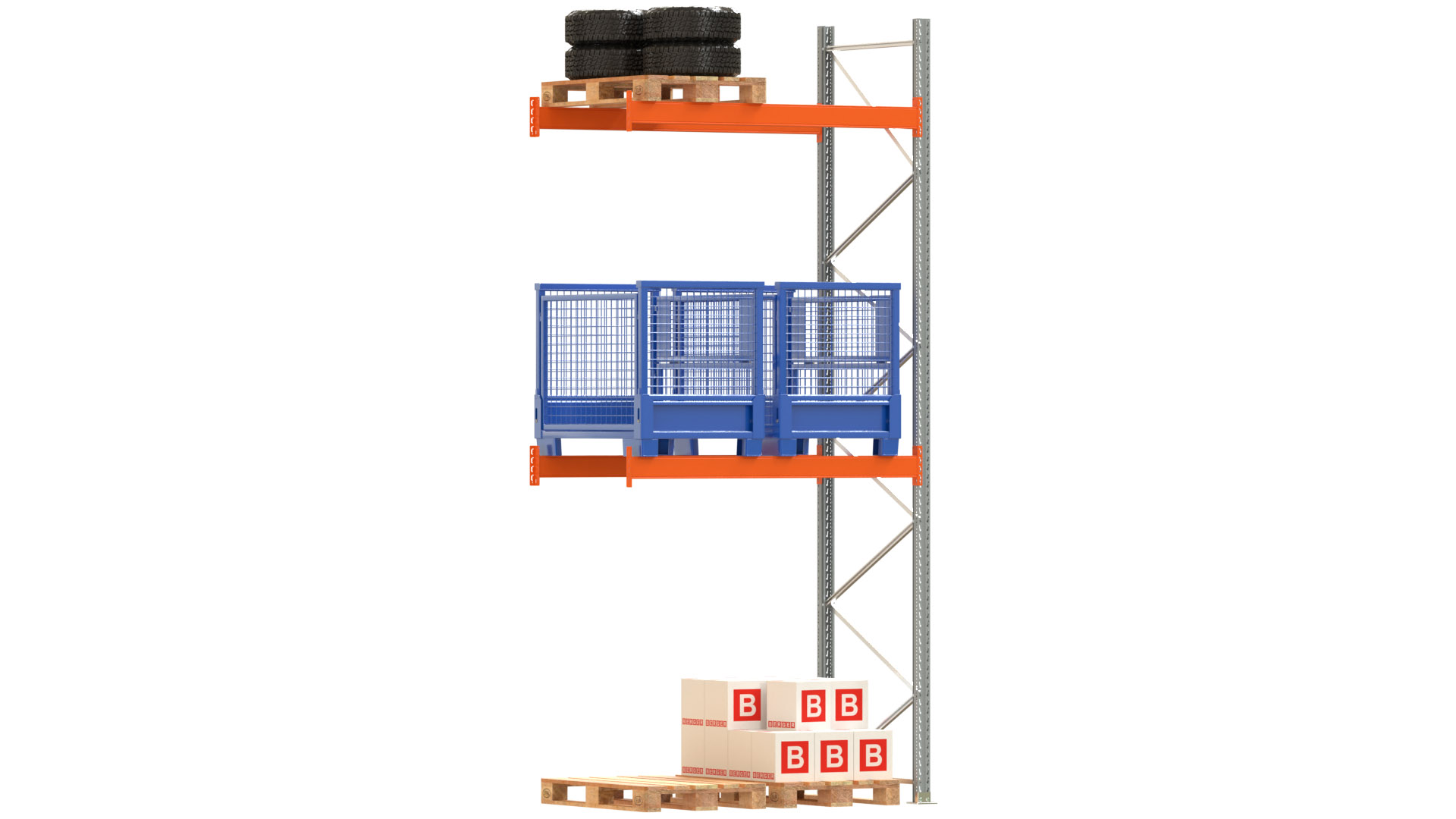ARTUS-Palettenregal - Anbaufeld - 3800-2 HxBxT 4500 x 1985 x 1100 mm mit 2 x Ebenen Auflageträger Variante 1900-125/1,5 - RAL 2004 Stützrahmen NCS S 4005 (ähnlich - RAL 7001 silbergrau) (Ausfachung verzinkt) Fachlast: 3.000 kg Feldlast: 6.000 kg bei max. Fachhöhe von 2.000 mm jeweils bei gleichmässig verteilter Last inkl. Bolzenanker